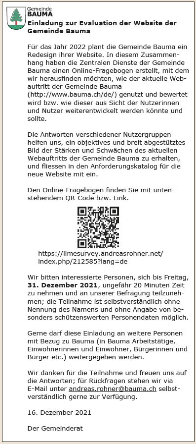 Einladung zur Evaluation der Website der Gemeinde Bauma; Link bzw. QR-Code zur Umfrage