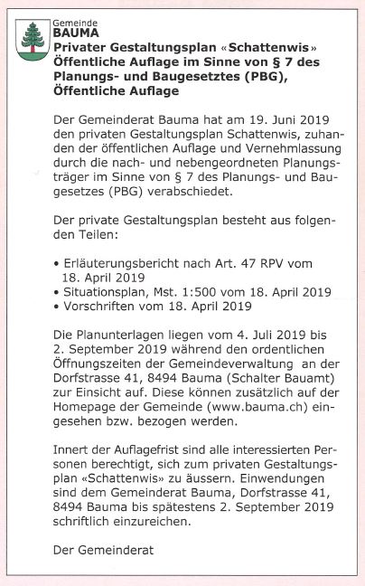 Privater Gestaltungsplan Schattenwis; Öffentliche Auflage im Sinne von § 7 des Planungs- und Baugesetzes